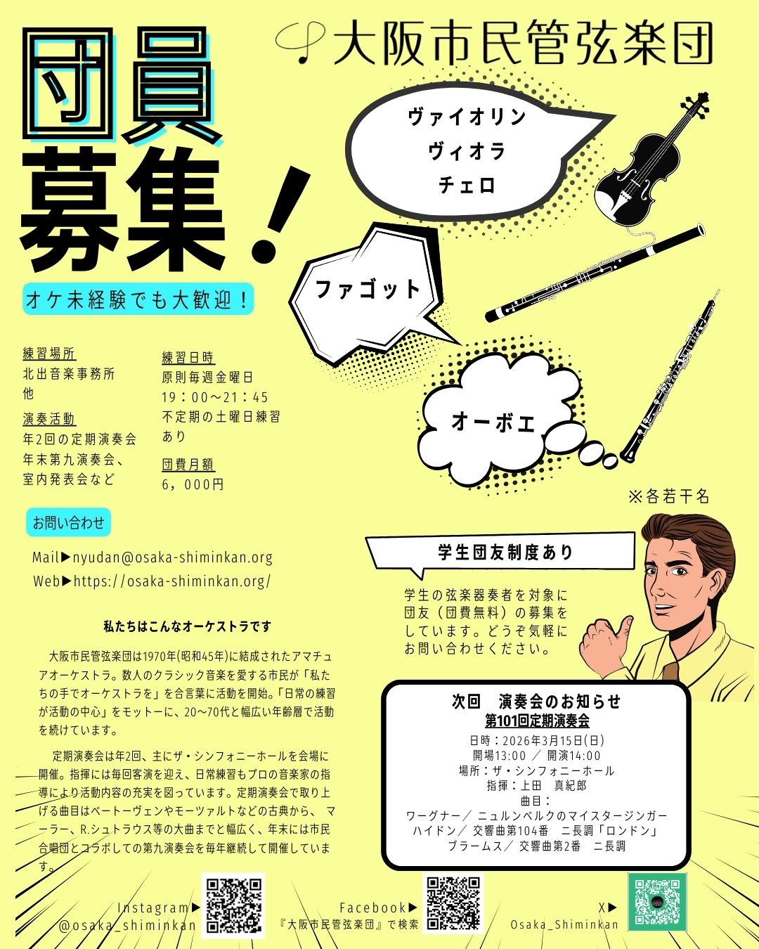 学生団友制度あり: 学生弦楽器奏者を対象に団友(団費無料)の募集をしております。